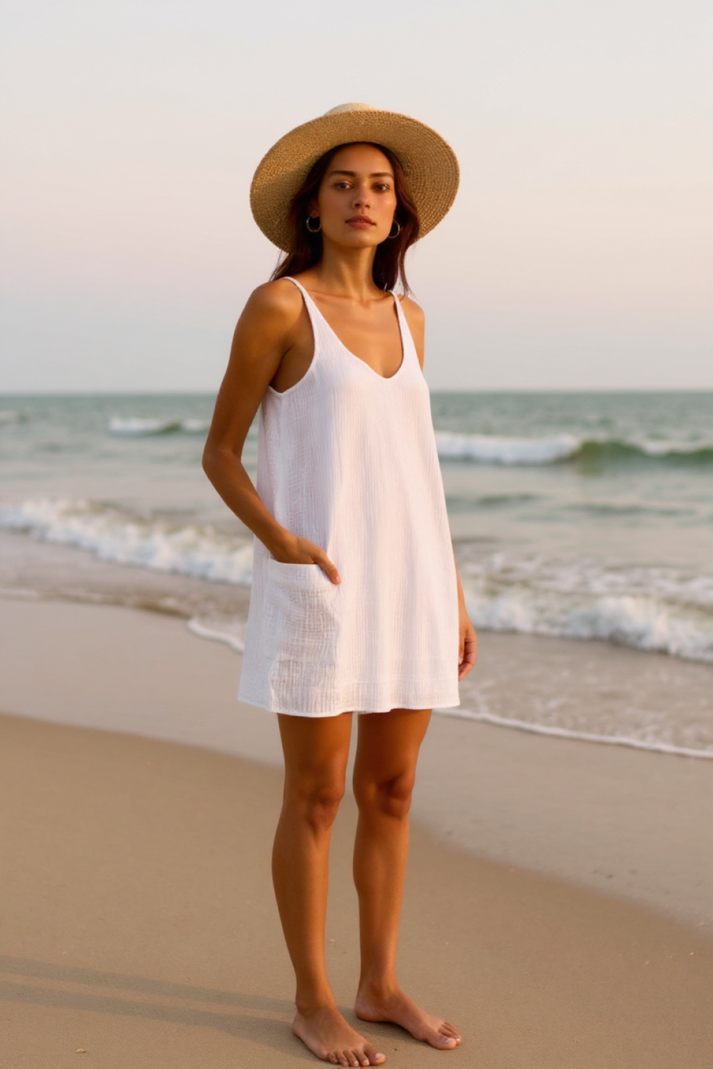 Hafif ve nefes alan kumaşı ile sıcak yaz günlerinde serinlik sağlayan cepli plaj elbisesi, plajda bikini veya mayo üzerine rahatlıkla giyilebileceği gibi, günlük hayatta da sandalet veya spor ayakkabı ile kombinlenerek modern bir tarz oluşturur. Mini boyu sayesinde genç ve dinamik bir görünüm sunarken, beyaz rengin sadeliği ile farklı aksesuarlarla kolayca uyum sağlar.