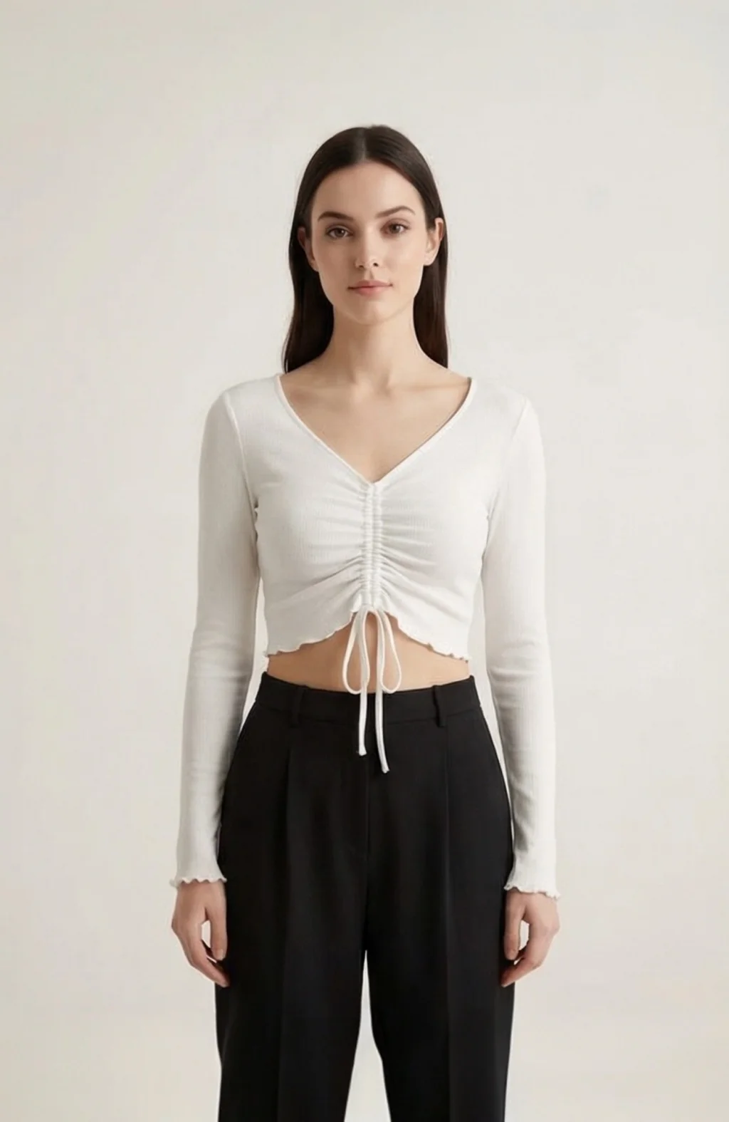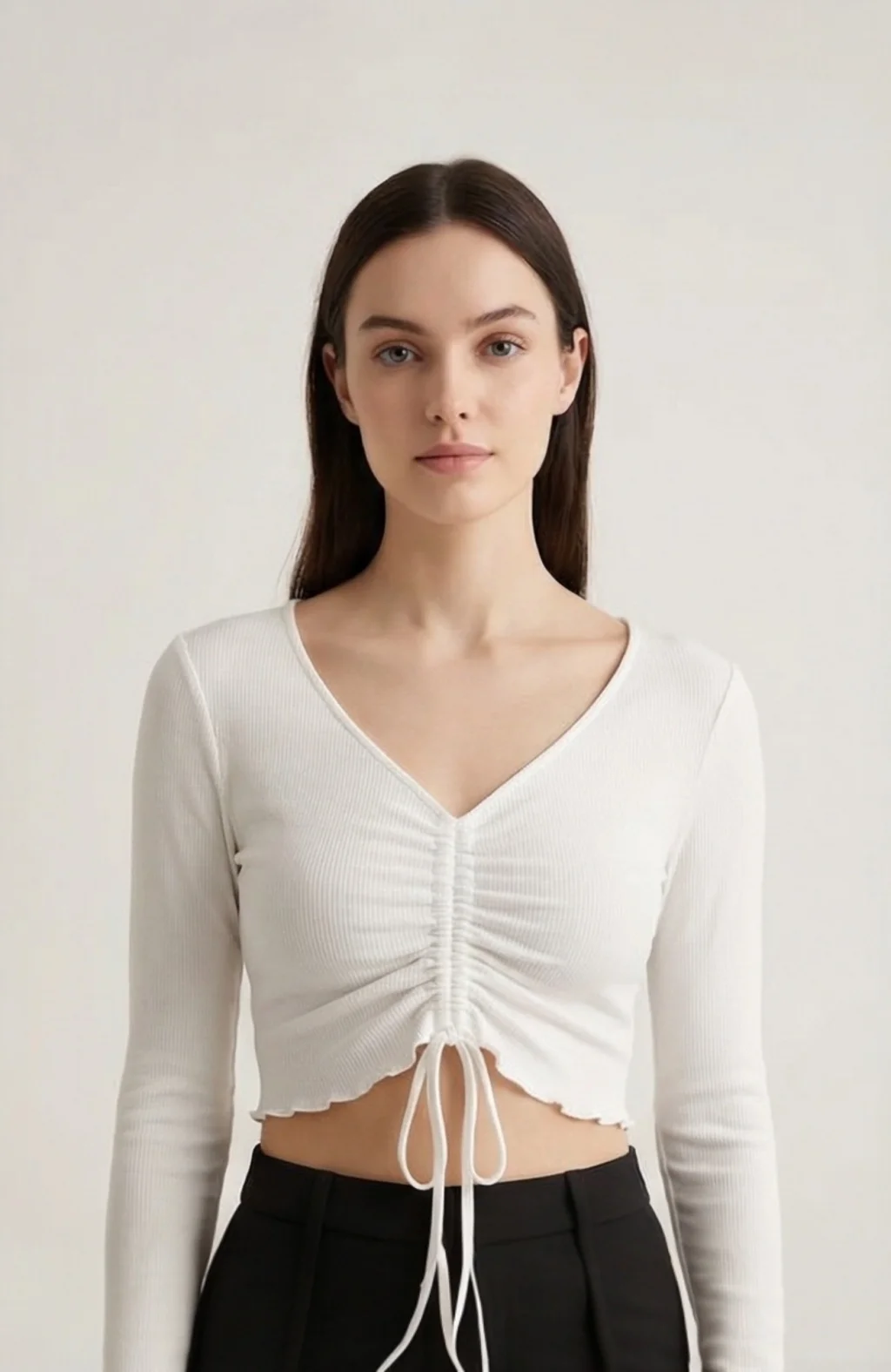 Kadın Beyaz Uzun Kollu Büzdürme Bağcık Detaylı Crop Top Bluz – Şık, Rahat ve Kolay Kombinlenebilir