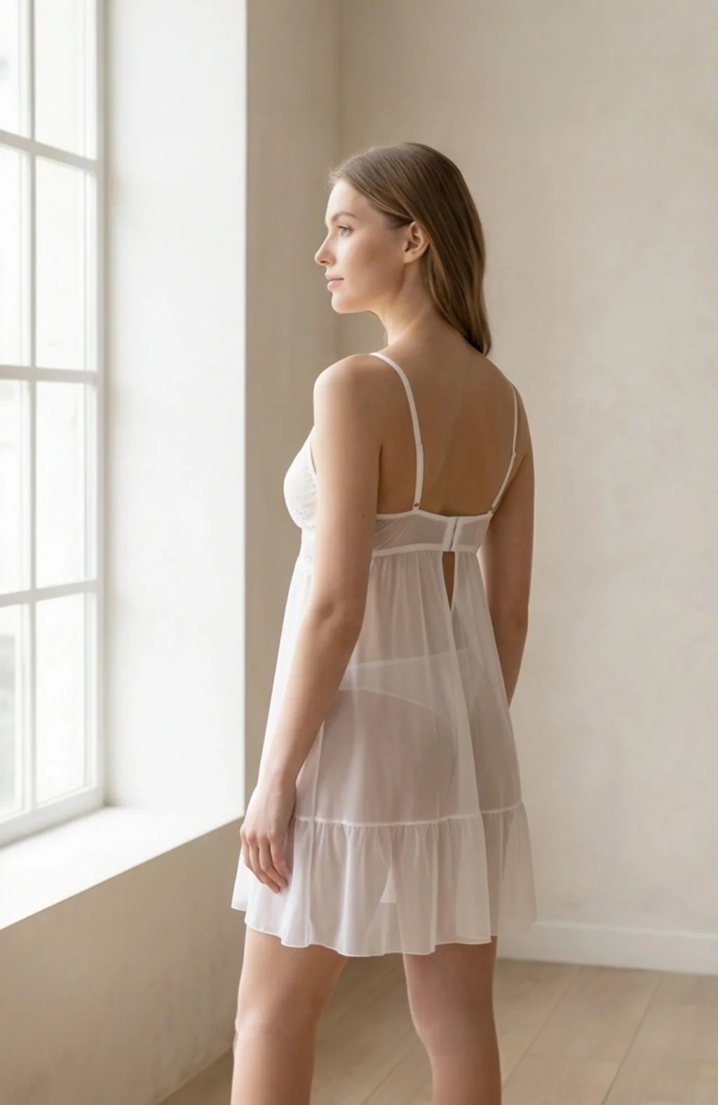 Kadın Beyaz Dantelli Sırtı Açık Gecelik – Modern ve Şık Tasarım