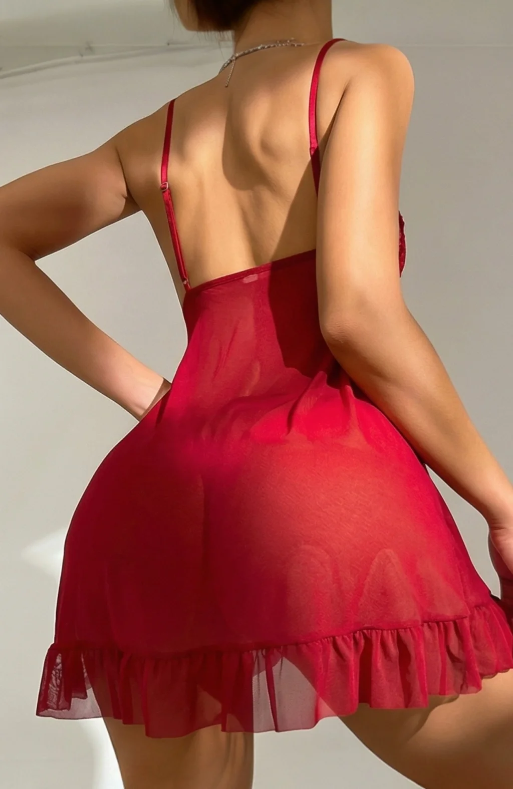 Kırmızı Dantelli ve Fırfırlı Tül Detaylı Gecelik Takımı