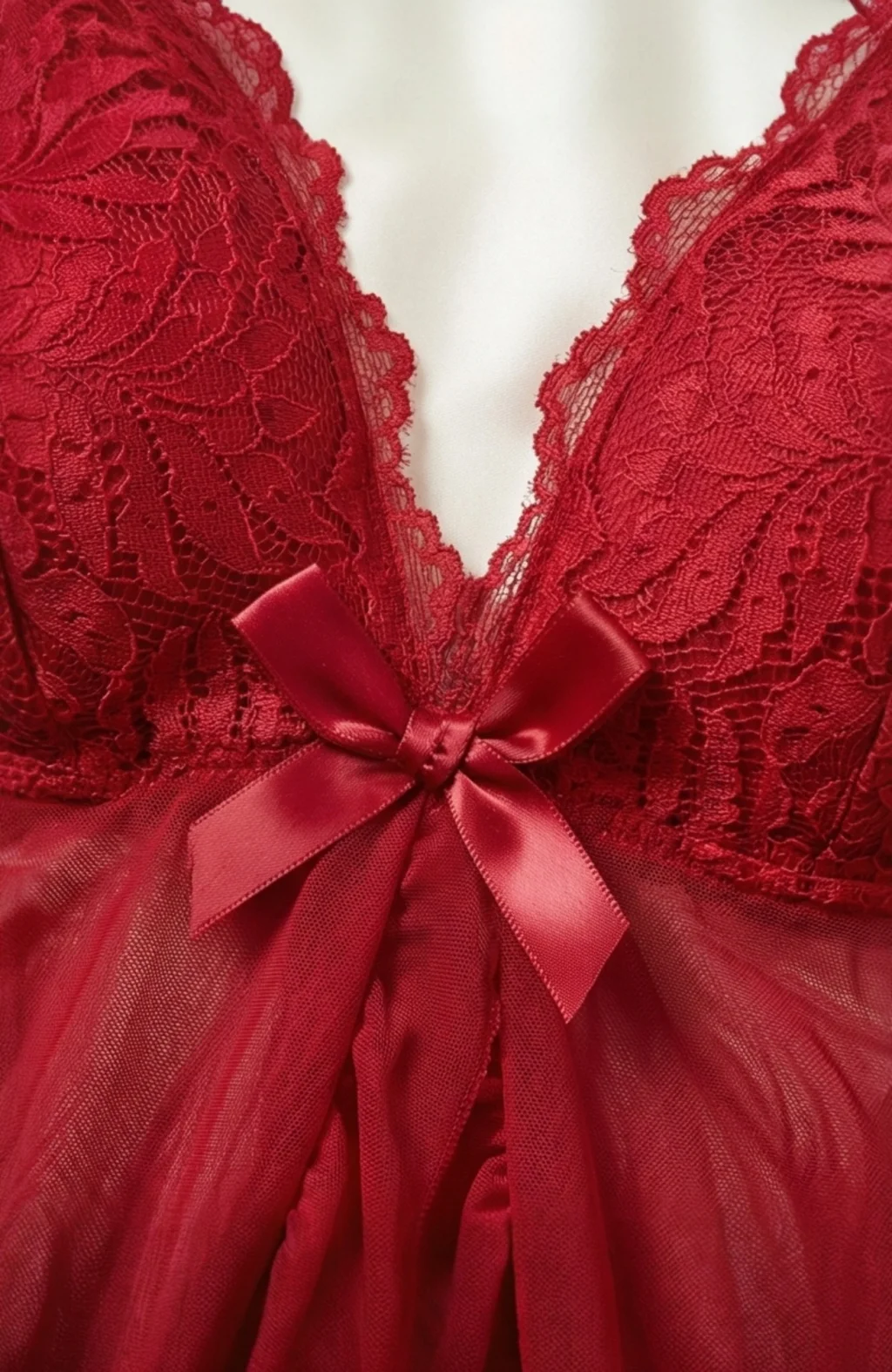 Zarif dantellerle süslenmiş kırmızı renkteki bu gecelik takımı, feminen dokunuşlarıyla göz alıcıdır.