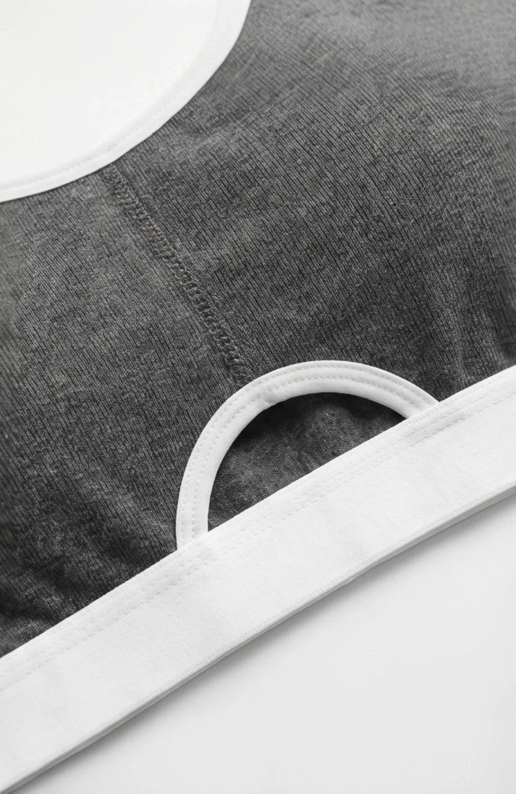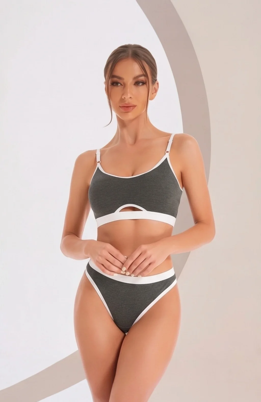 Kadın Gri Antrasit Kaşkorse ve Beyaz Lastikli Cut-Out Tanga Külotlu Takım – Modern, Konforlu