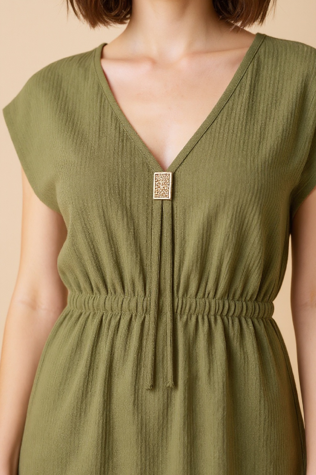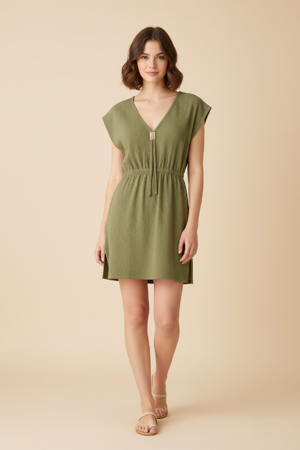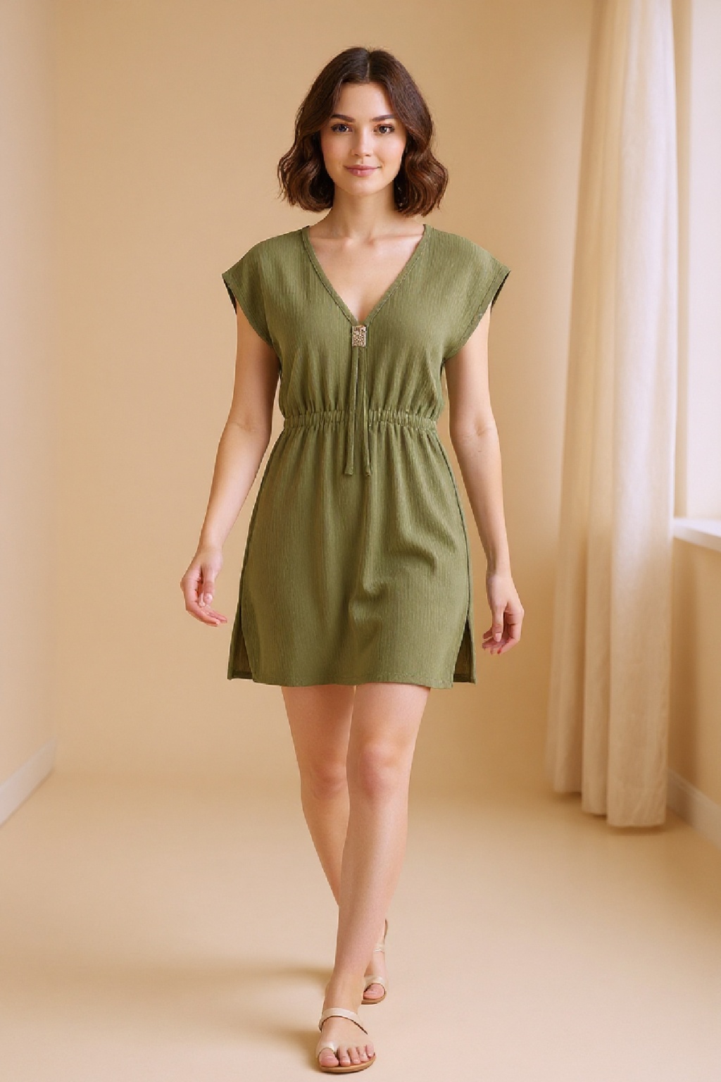 • Kadın Haki Yanları Yırtmaçlı Tokalı V Yaka Mini Plaj Elbisesi, doğanın huzur veren tonlarını modern bir tasarımla buluşturuyor.