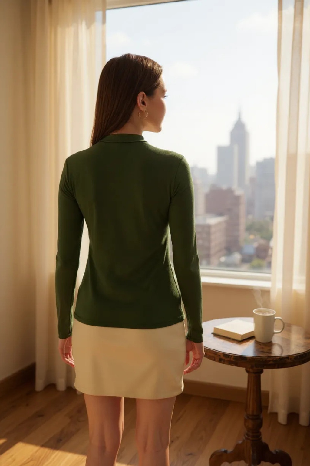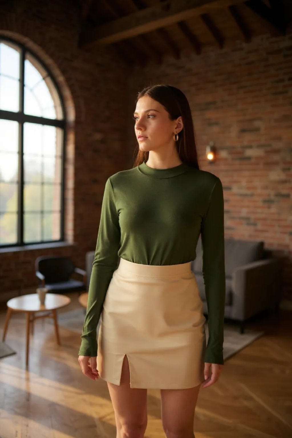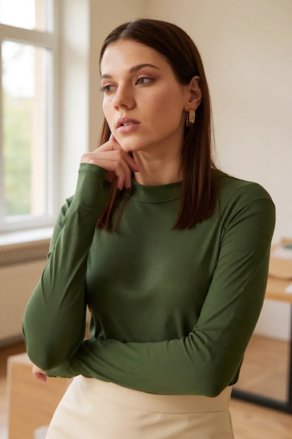 Doğal tonların modern yorumuyla öne çıkan Kadın Haki Yeşili Parmak Detaylı Esnek Uzun Kollu Body, gardırobunuzun trend parçalarından biri olacak.Rahat ve şık kesimi sayesinde günlük kombinlerinizde fark yaratır, aynı zamanda özel günlerde sofistike bir duruş kazandırır.Esnek kumaş yapısı, gün boyu konfor sağlarken vücudu sararak feminen bir hat oluşturur. Parmak detaylı uzun kollu body, haki yeşil rengin doğal ve modern havasıyla birleşerek casual ve şık kombinlere uyum sağlar.Öne Çıkan ÖzelliklerRenk: Haki Yeşili (doğal ve trend)Parmak detaylı uzun kollu tasarımEsnek, nefes alabilen kumaşFit kalıp, vücuda oturan kesimGünlük ve ofis kombinlerine uygunCasual ve modern stiller için idealKombin ÖnerileriGünlük Şıklık: Skinny jean ve beyaz sneaker ile spor-şık görünümGece Kombini: Siyah deri pantolon ve topuklularla iddialı bir stilOfis Stili: Krem rengi blazer altına giyilerek sofistike kombinSokak Modası: Mom jean veya şort ile rahat ve modern havaYıkama & Bakım Talimatı30°C’de hassas yıkama önerilirÇamaşır suyu kullanılmamalıdırDüşük ısıda tersten ütülenmelidirSererek kurutma tavsiye edilirBu kadın haki yeşili uzun kollu body, doğallığı ve şıklığı aynı anda sunarak hem günlük hem de özel kombinlerinizde vazgeçilmez bir parça olacak.]]>