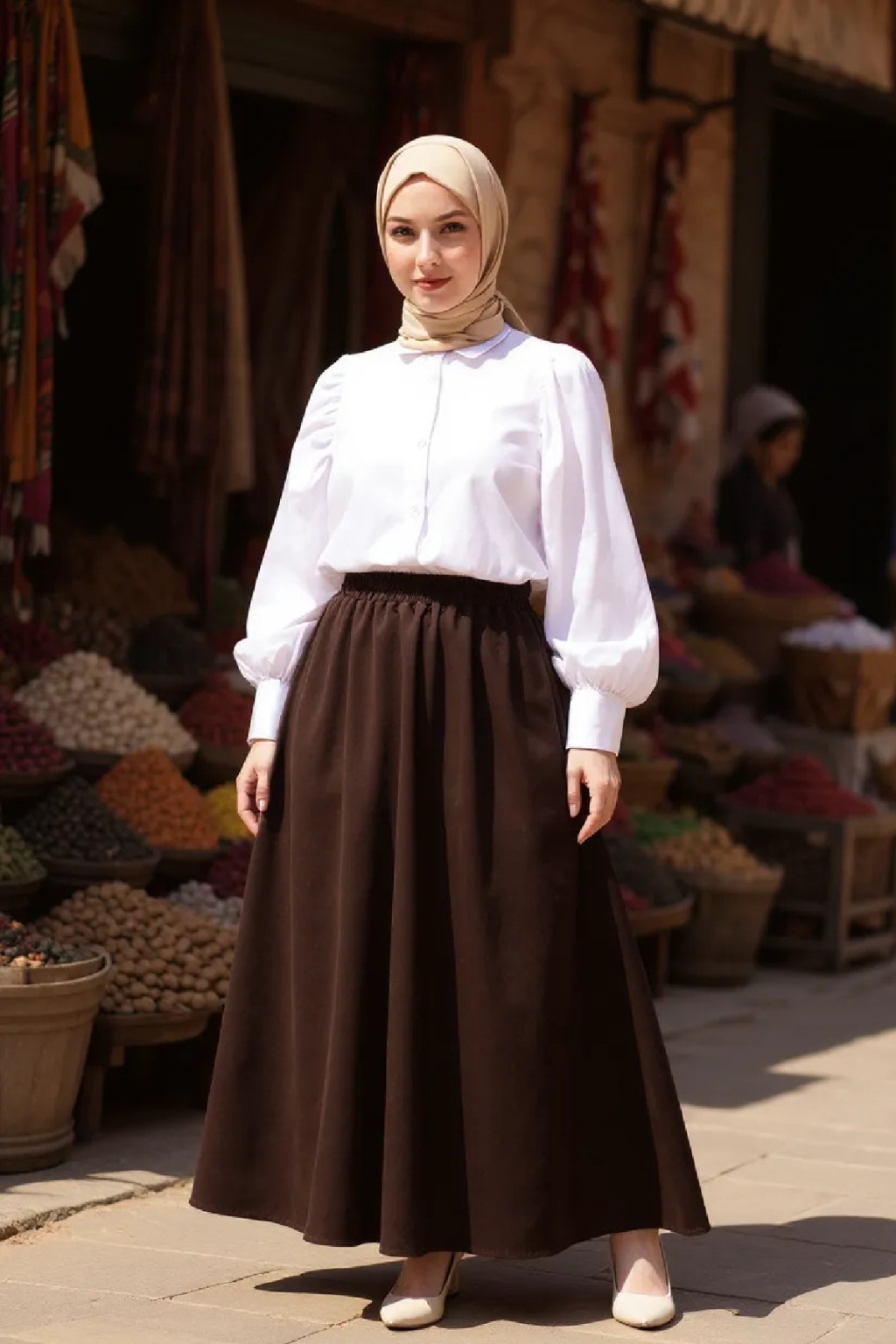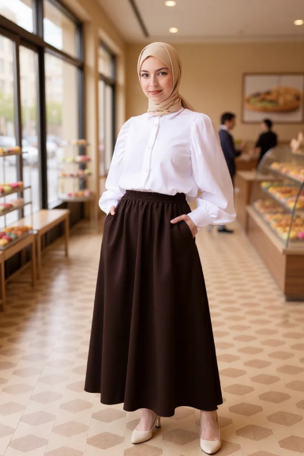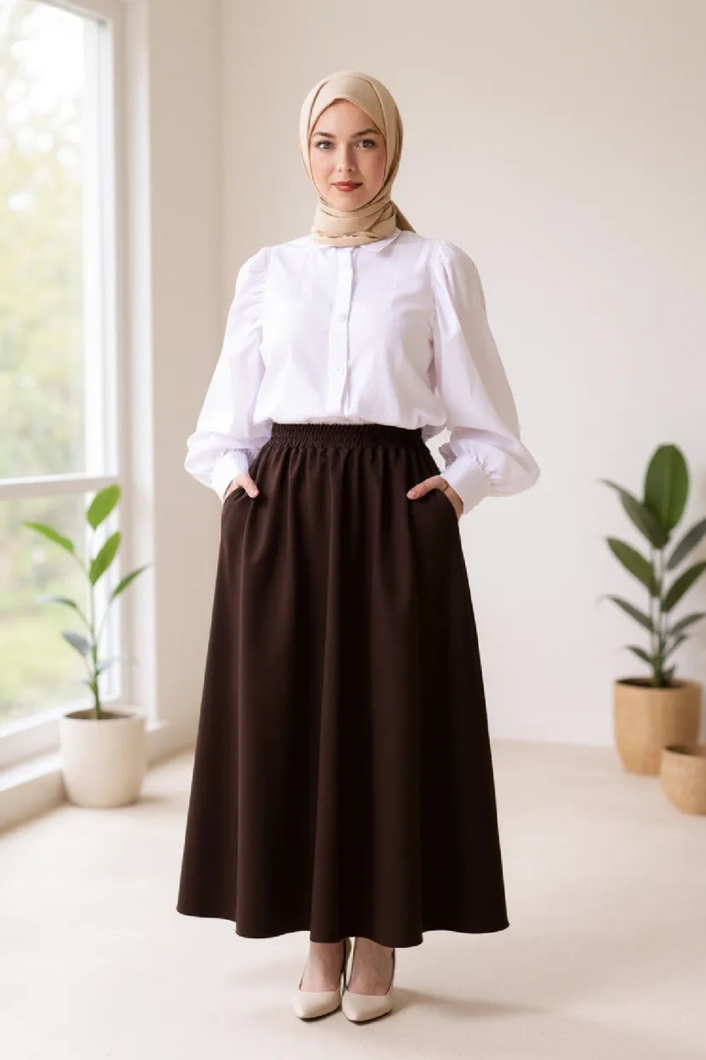 Doğal tonların zarafetini yansıtan Kadın Kahverengi Double Kumaş Beli Lastikli Cepli Uzun Etek, hem günlük kombinlerde hem de özel günlerde şıklık ve rahatlığı bir arada sunar.Yumuşak ve tok yapısıyla öne çıkan double kumaş, eteğin formunu koruyarak modern bir görünüm sağlar.95 cm uzunluğu tesettür giyime uygun bir tarz sunarken, kahverengi rengi ise sıcak ve sofistike bir hava katar.Lastikli bel detayı, farklı bedenlere uyum sağlayarak gün boyu konforlu bir kullanım imkânı verir.Yan cepler ise şıklığa işlevsellik katarken günlük hayatta pratiklik sağlar.Kahverenginin kolay kombinlenebilir yapısı sayesinde soft tonlardan canlı renklere kadar birçok parça ile rahatlıkla eşleşir.Kombin ÖnerileriDoğal & Sade Kombin: Kahverengi eteği bej oversize gömlek, krem şal ve düz babetlerle kombinleyerek zarif ve doğal bir görünüm elde edebilirsiniz.Ofis Şıklığı: Beyaz uzun tunik, kahve tonlarında şal ve klasik loafer ayakkabılarla profesyonel ve modern bir ofis stili oluşturabilirsiniz.Sonbahar Tarzı: Triko kazak, uzun trençkot, kahve desenli şal ve kısa botlarla sonbaharın sıcak tonlarını yansıtan kombinler yapabilirsiniz.Günlük Rahatlık: Salaş basic tişört, pamuk şal ve spor ayakkabılarla şık ve konforlu bir gün geçirebilirsiniz.Özel Gün Kombini: Ipek gömlek, inci detaylı şal ve topuklu ayakkabılarla kahverengi eteği davetlerde zarif bir şekilde kullanabilirsiniz.Ürün ÖzellikleriKumaş Türü: Double KumaşBel: Lastikli, esnek yapıDetay: Yan cepliBoy: 95 CMRenk: KahverengiKullanım Alanı: Günlük yaşam, ofis, davet, özel günler, tesettür kombinleriBu parça, kahverenginin sıcak tonuyla gardırobunuza doğal bir şıklık katacak ve dört mevsim farklı kombinlerle kullanabileceğiniz kurtarıcı bir seçenek olacaktır.]]>