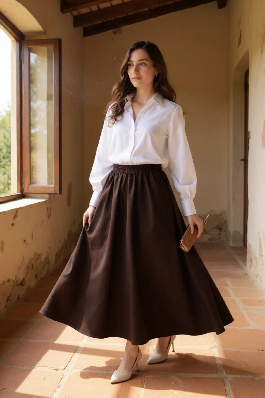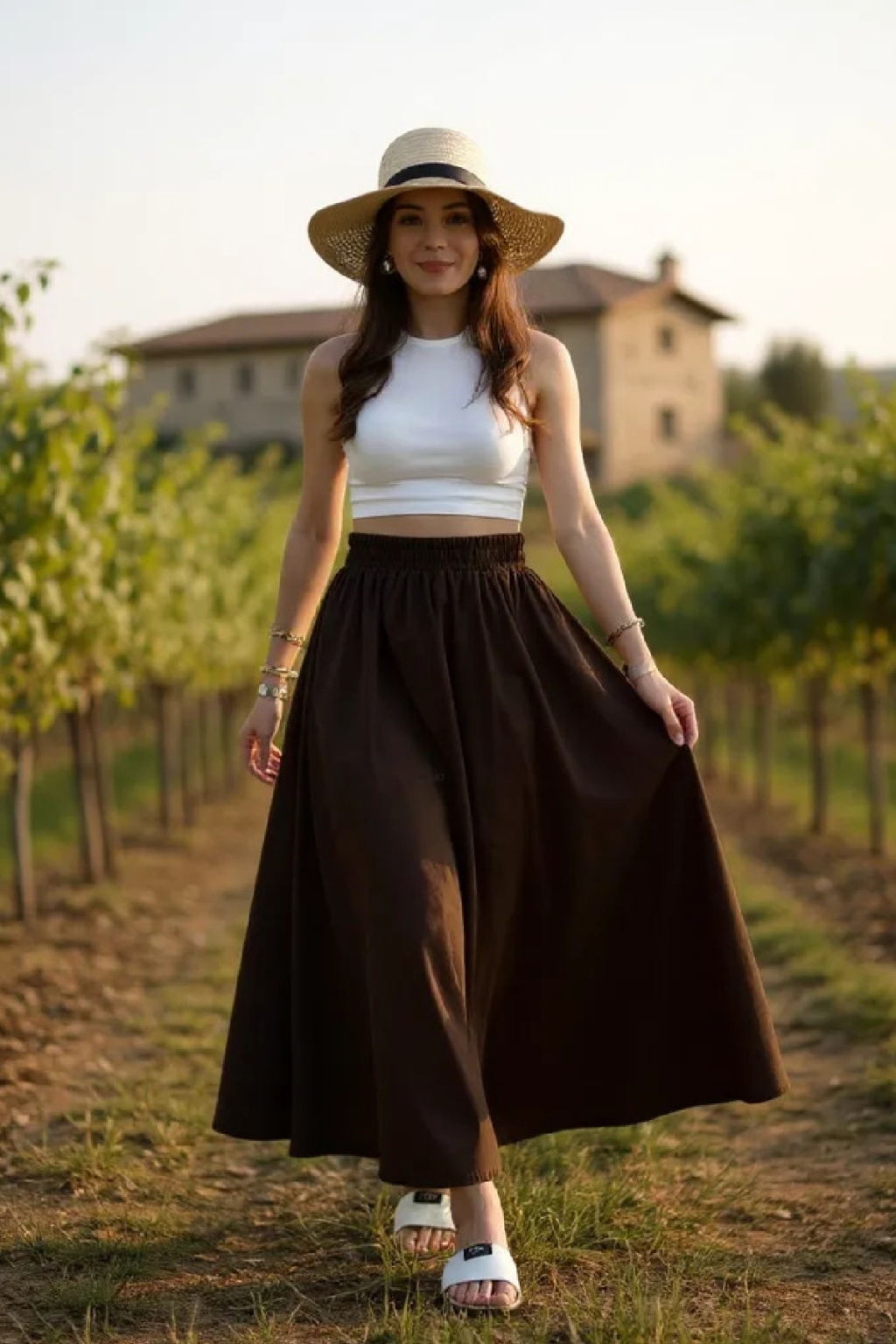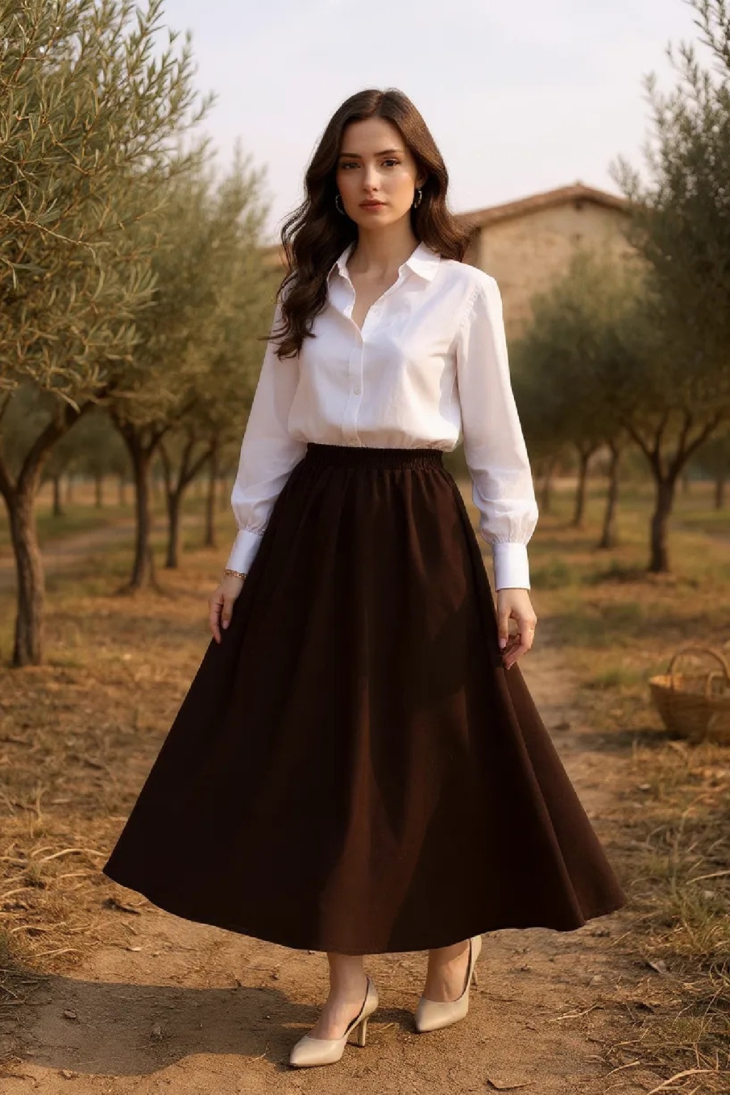 Doğal tonların zarafetini yansıtan Kadın Kahverengi Double Kumaş Beli Lastikli Cepli Uzun Etek, hem günlük kombinlerde hem de özel günlerde şıklık ve rahatlığı bir arada sunar.Yumuşak ve tok yapısıyla öne çıkan double kumaş, eteğin formunu koruyarak modern bir görünüm sağlar.95 cm uzunluğu tesettür giyime uygun bir tarz sunarken, kahverengi rengi ise sıcak ve sofistike bir hava katar.Lastikli bel detayı, farklı bedenlere uyum sağlayarak gün boyu konforlu bir kullanım imkânı verir.Yan cepler ise şıklığa işlevsellik katarken günlük hayatta pratiklik sağlar.Kahverenginin kolay kombinlenebilir yapısı sayesinde soft tonlardan canlı renklere kadar birçok parça ile rahatlıkla eşleşir.Kombin ÖnerileriDoğal & Sade Kombin: Kahverengi eteği bej oversize gömlek, krem şal ve düz babetlerle kombinleyerek zarif ve doğal bir görünüm elde edebilirsiniz.Ofis Şıklığı: Beyaz uzun tunik, kahve tonlarında şal ve klasik loafer ayakkabılarla profesyonel ve modern bir ofis stili oluşturabilirsiniz.Sonbahar Tarzı: Triko kazak, uzun trençkot, kahve desenli şal ve kısa botlarla sonbaharın sıcak tonlarını yansıtan kombinler yapabilirsiniz.Günlük Rahatlık: Salaş basic tişört, pamuk şal ve spor ayakkabılarla şık ve konforlu bir gün geçirebilirsiniz.Özel Gün Kombini: Ipek gömlek, inci detaylı şal ve topuklu ayakkabılarla kahverengi eteği davetlerde zarif bir şekilde kullanabilirsiniz.Ürün ÖzellikleriKumaş Türü: Double KumaşBel: Lastikli, esnek yapıDetay: Yan cepliBoy: 95 CMRenk: KahverengiKullanım Alanı: Günlük yaşam, ofis, davet, özel günler, tesettür kombinleriBu parça, kahverenginin sıcak tonuyla gardırobunuza doğal bir şıklık katacak ve dört mevsim farklı kombinlerle kullanabileceğiniz kurtarıcı bir seçenek olacaktır.]]>