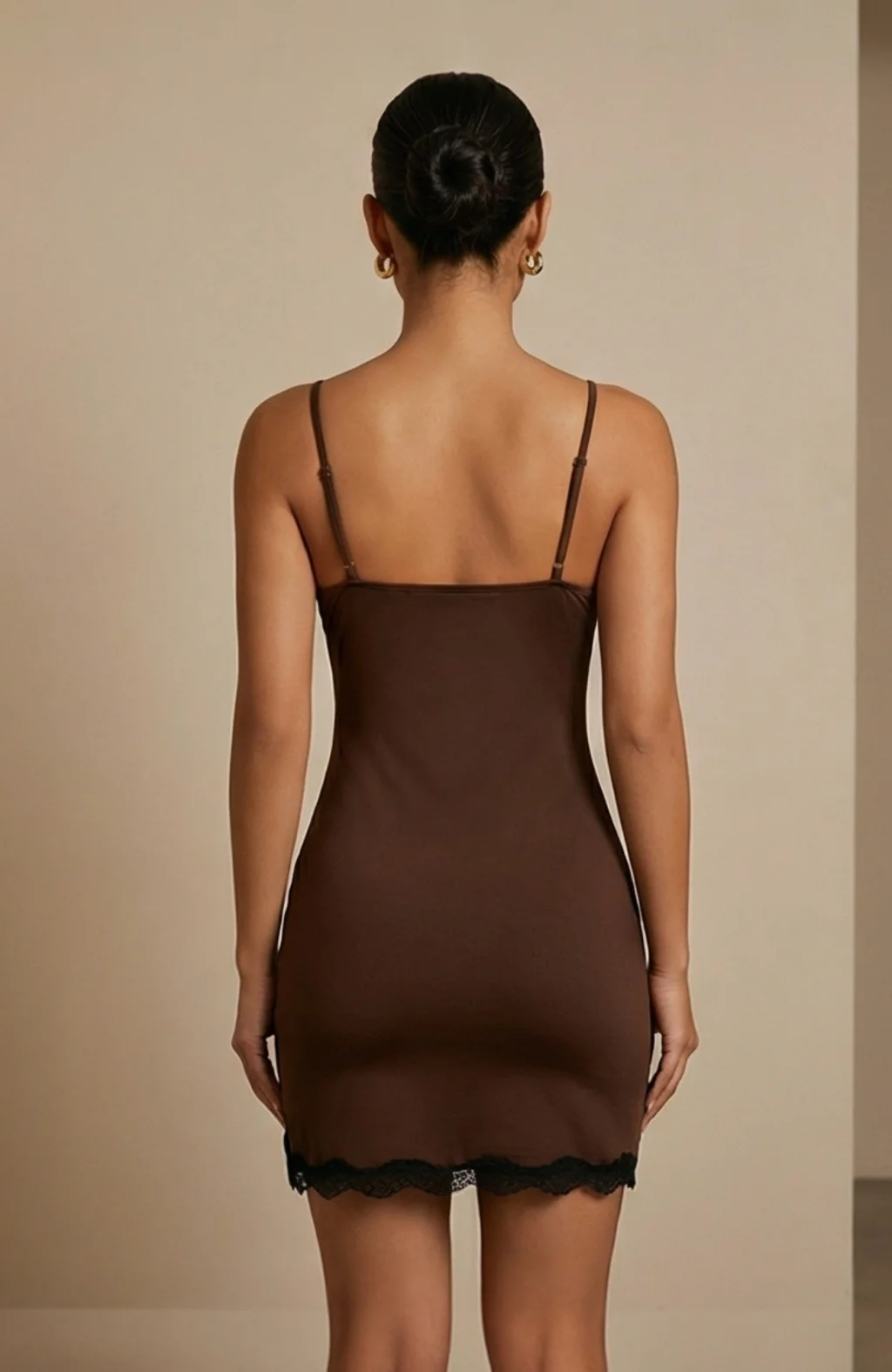 Kadın Kahverengi Göğsü ve Bacakları Dantelli Yırtmaçlı Şık Gecelik – Modern ve Şık Tasarım