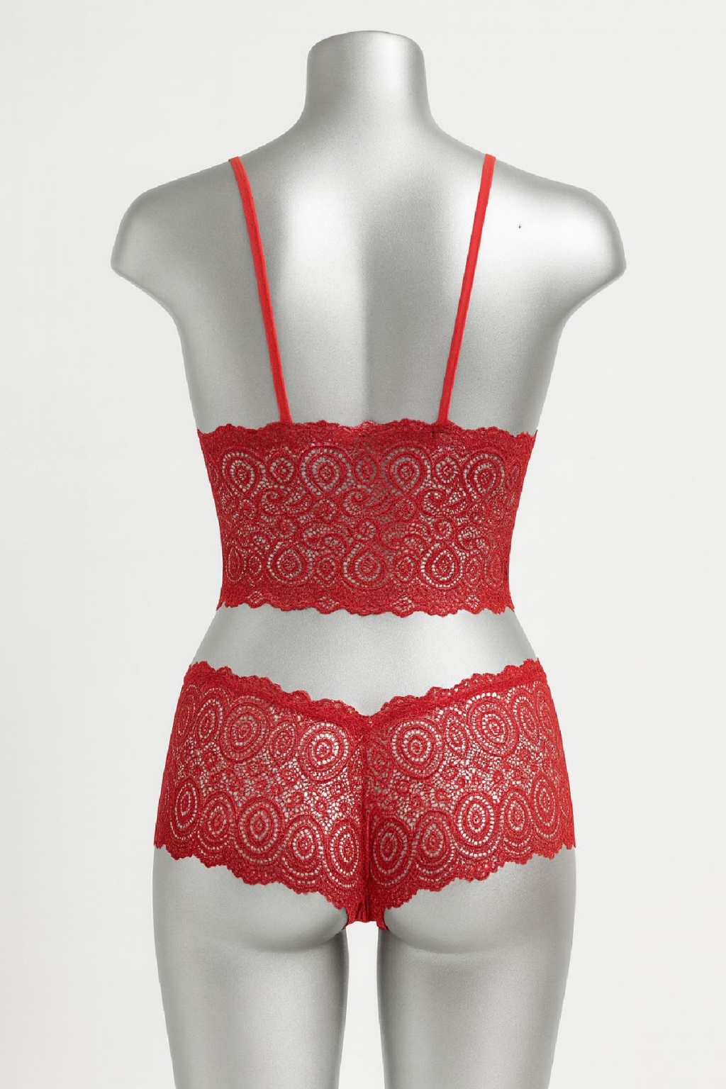 Tutkunun simgesi olan kırmızı dantel bralet şort takımı, cesur ve feminen bir görünüm isteyenler için özel olarak tasarlandı.