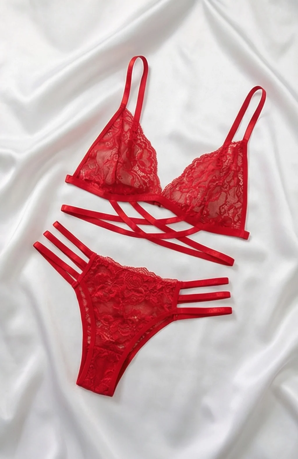 Kırmızı Çapraz Ip Detaylı Şık Sütyen Külot Takım