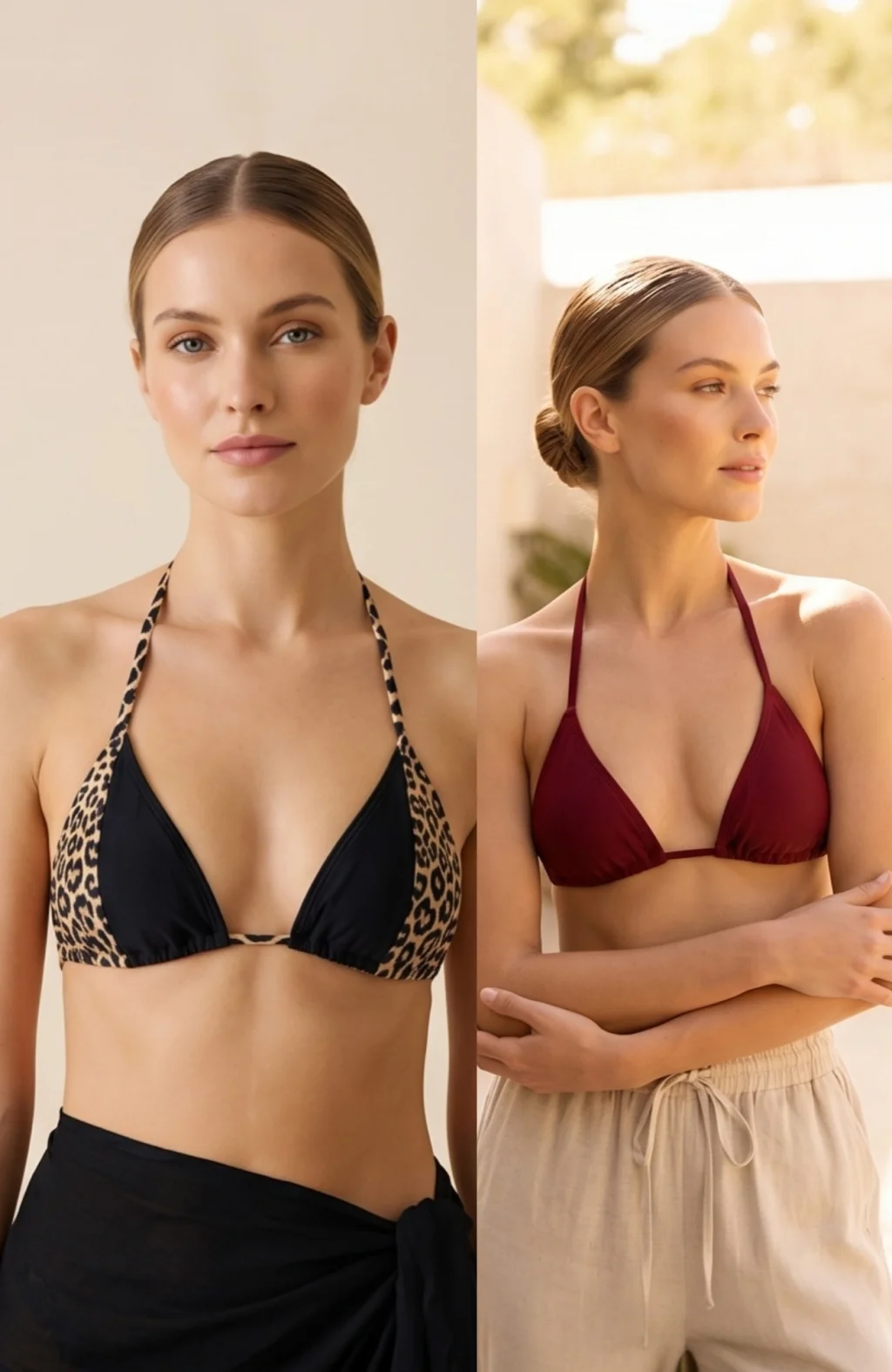Kadın Leopar Desenli ve Bordo Minimal Kesim Üçgen Bikini Üstü – Modern ve Şık Tasarım