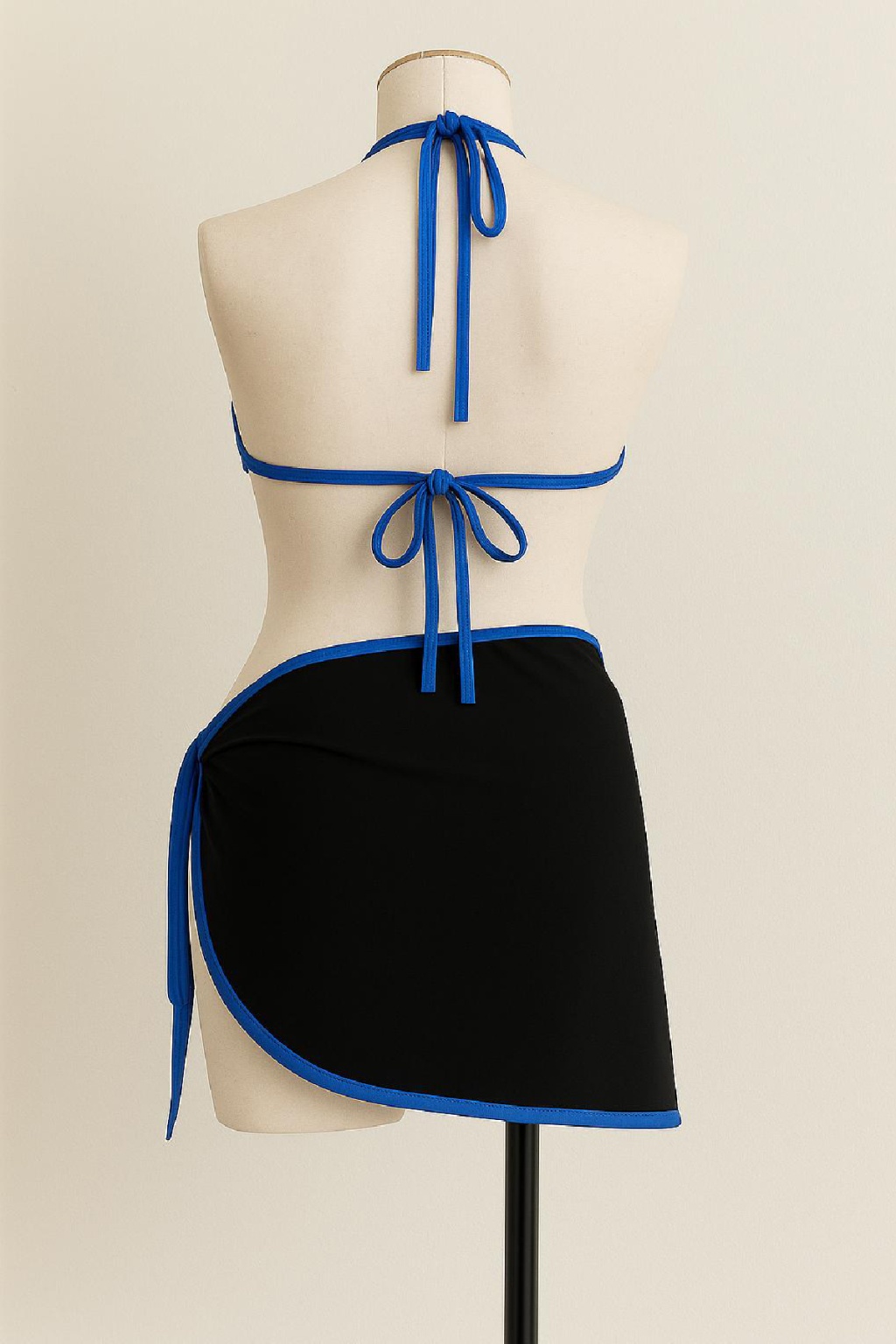 Mavi pareolu, yandan ve boyundan bağlamalı üçlü bikini takımı ile plajda şıklığınızı konuşturun.