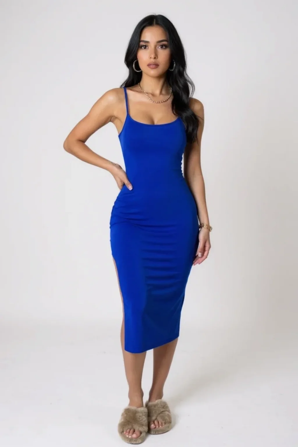 Kadın Mavi Yırtmaçlı Diz Altı Vücüdu Saran Gecelik