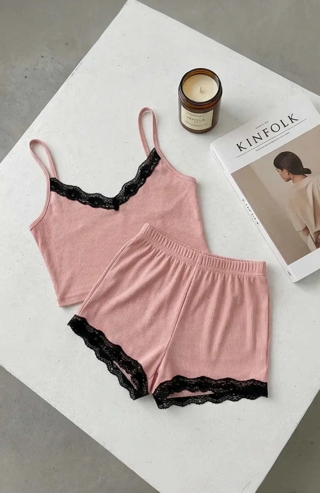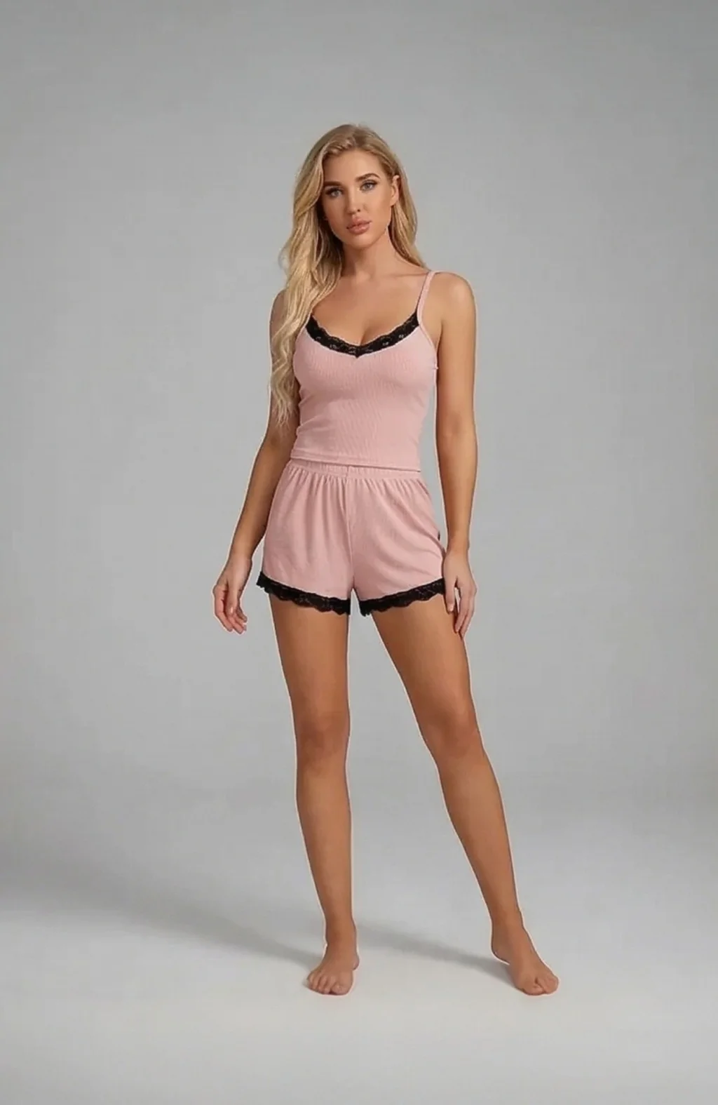 Kadın Pembe Alt Ve Üst Dantel Detaylı Şortlu Gecelik Takımı – Modern, Konforlu ve Günlük Kombinlere Uygun