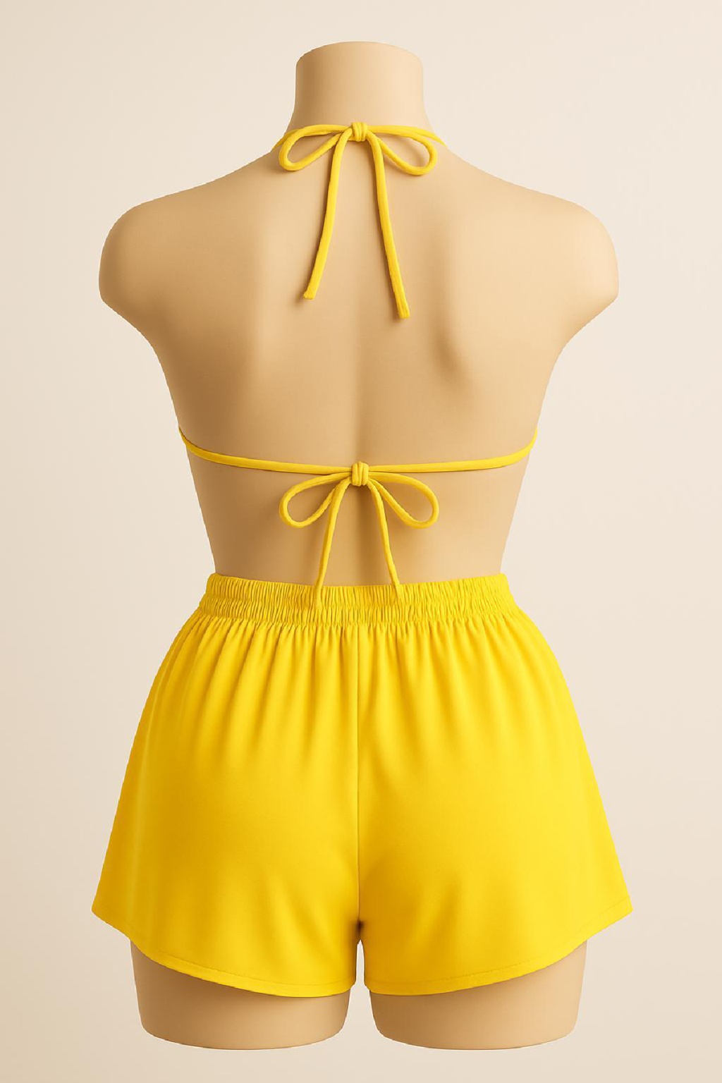 İki parçadan oluşan set; üst parça olarak bralet bikini üstü ve alt parça olarak şortlu bikini altını içerir.