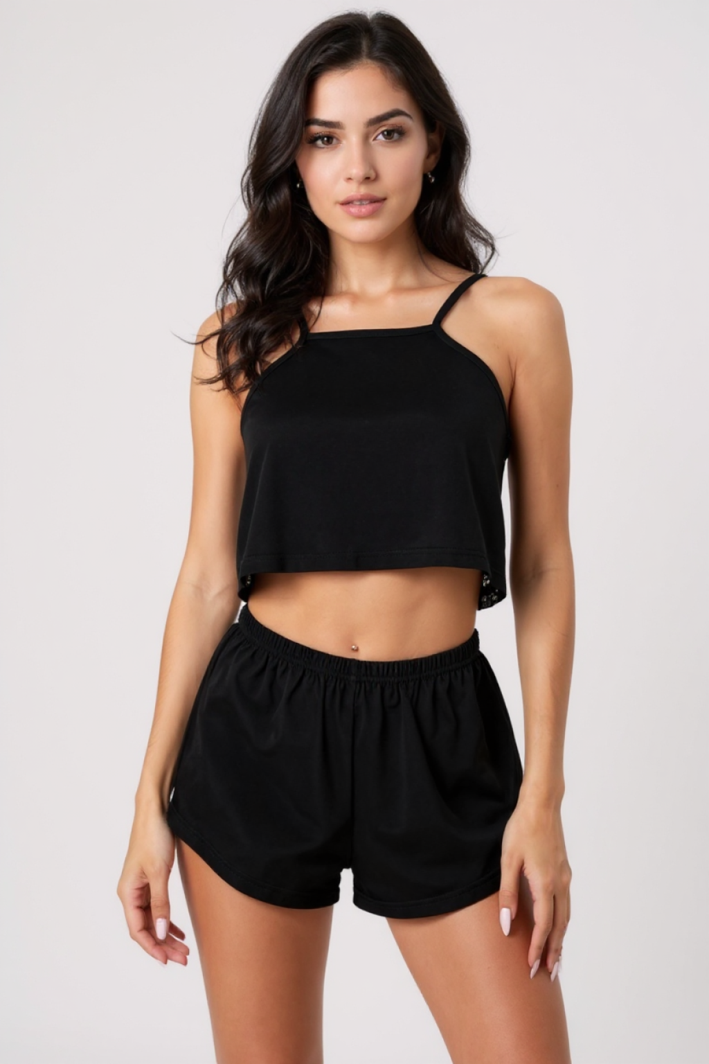 Kadın Siyah Askılı Crop Top ve Şortlu Gecelik Takım