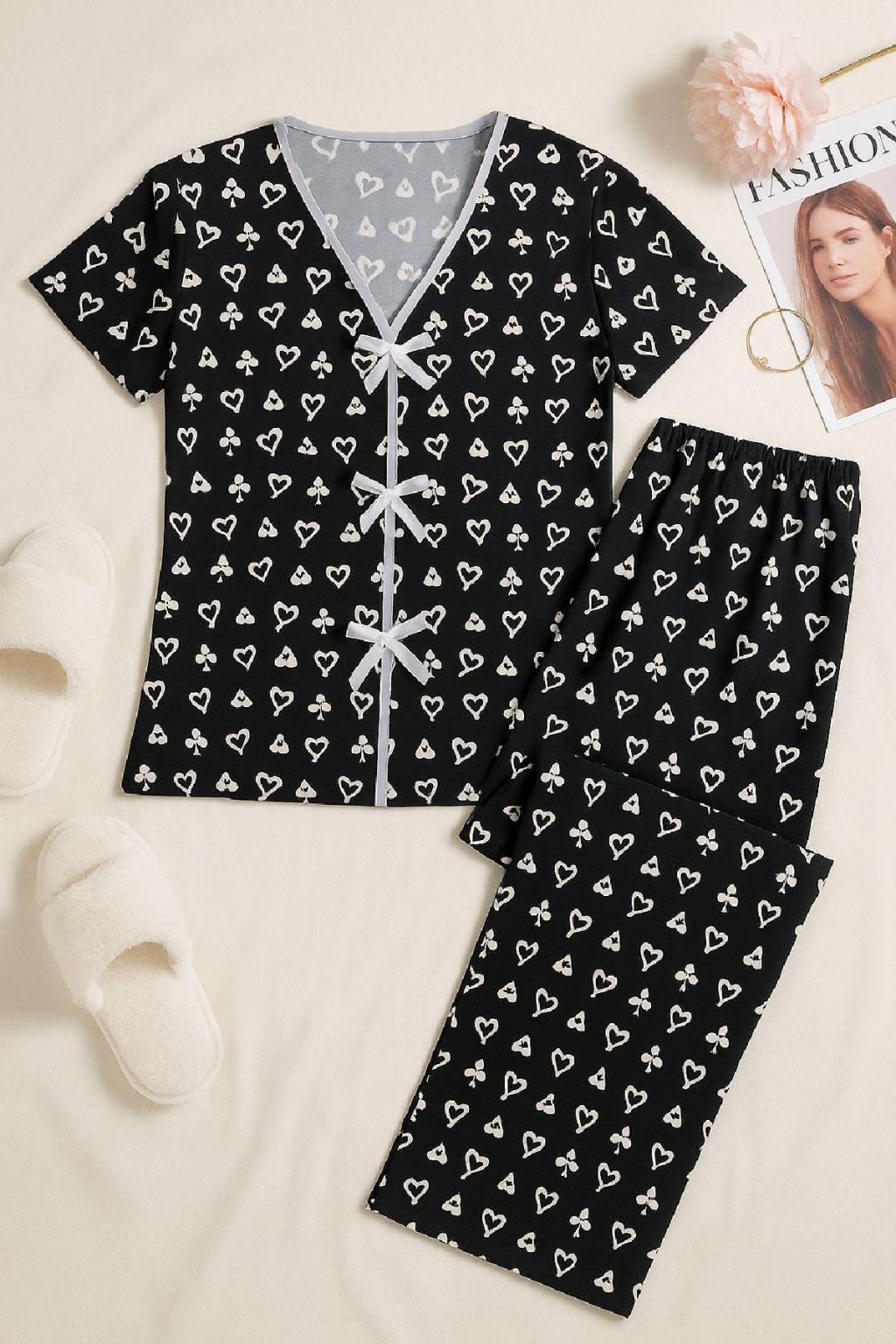 gündüzlerinizi şık hale getiren kadın siyah kalp desenli pijama takımı,