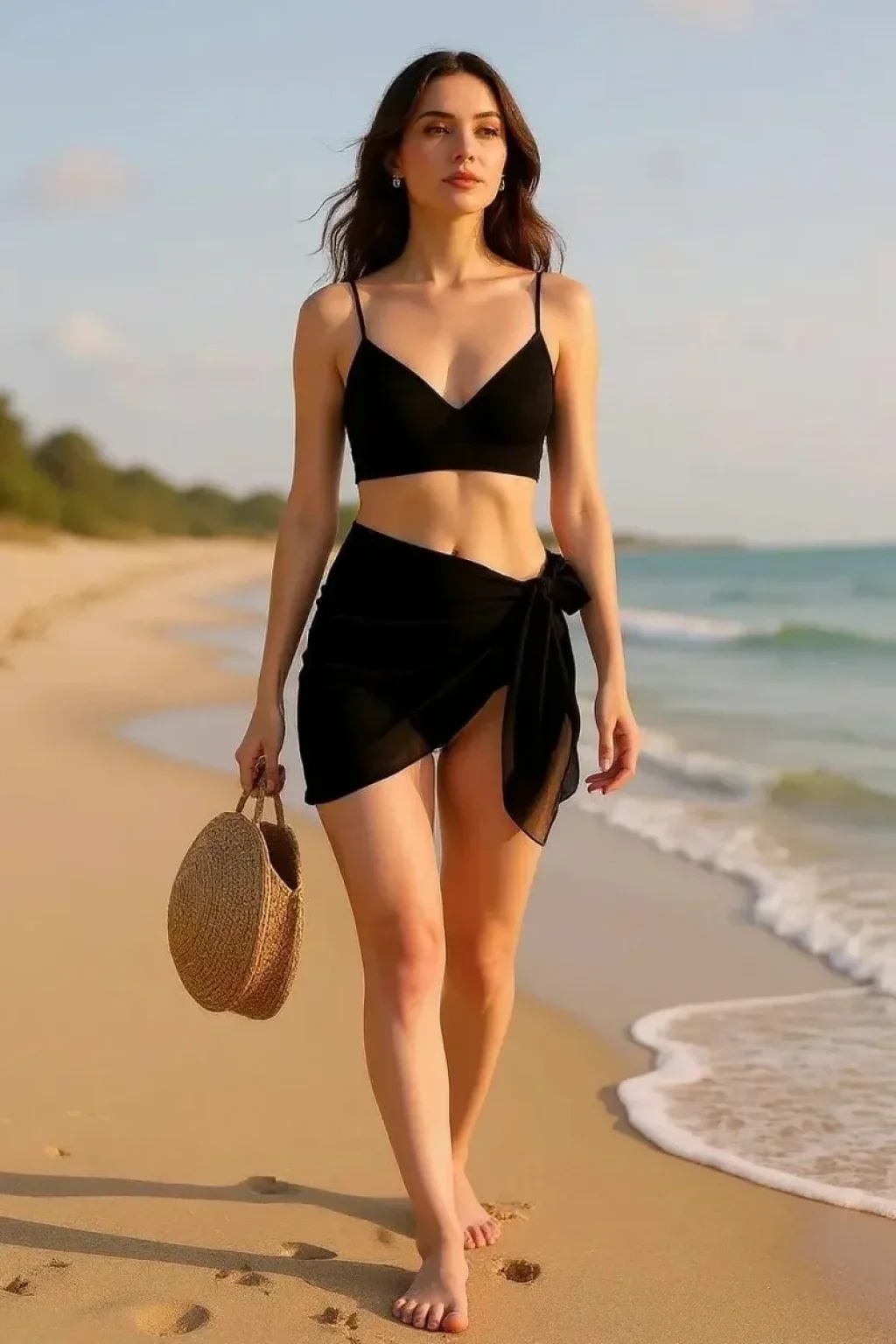 Kadın Siyah Çapraz Bağlamalı Crop ve Pareo 2'li Set – Modern ve Şık Tasarım