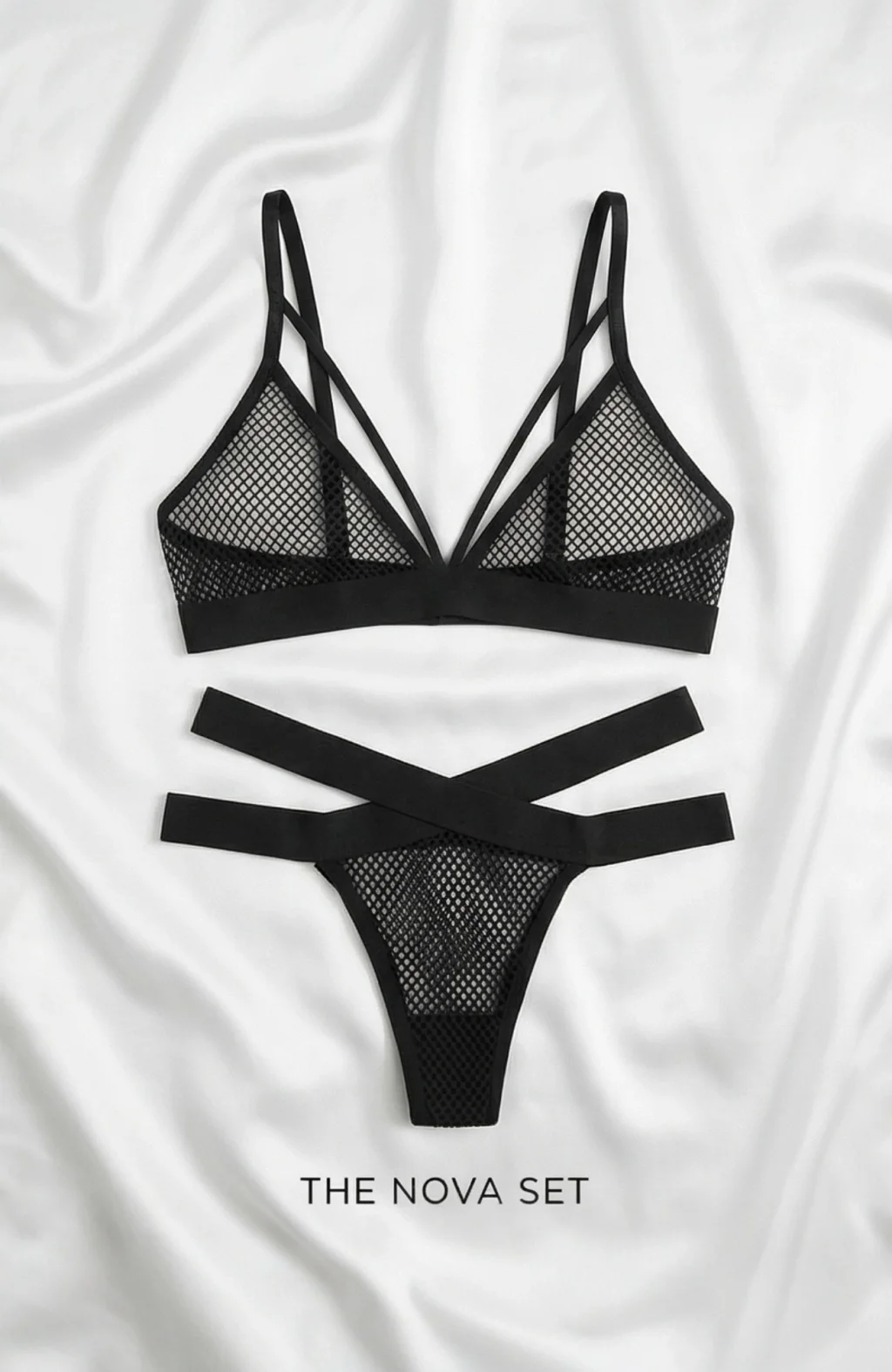 Kadın Siyah Fileli Beli Çapraz Lastikli Sütyen Takımı – Modern, Konforlu ve Günlük Kombinlere Uygun