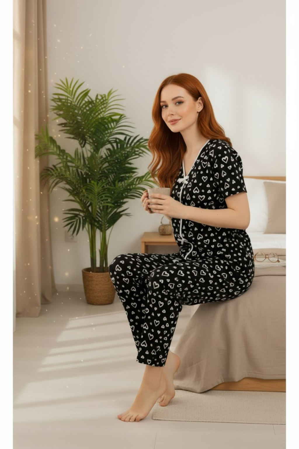 Kadın Siyah Kalp Desenli Fiyonklu Kısa Kollu Uzun Pijama Takımı, sade şıklığı ve konforu bir araya getiriyor.