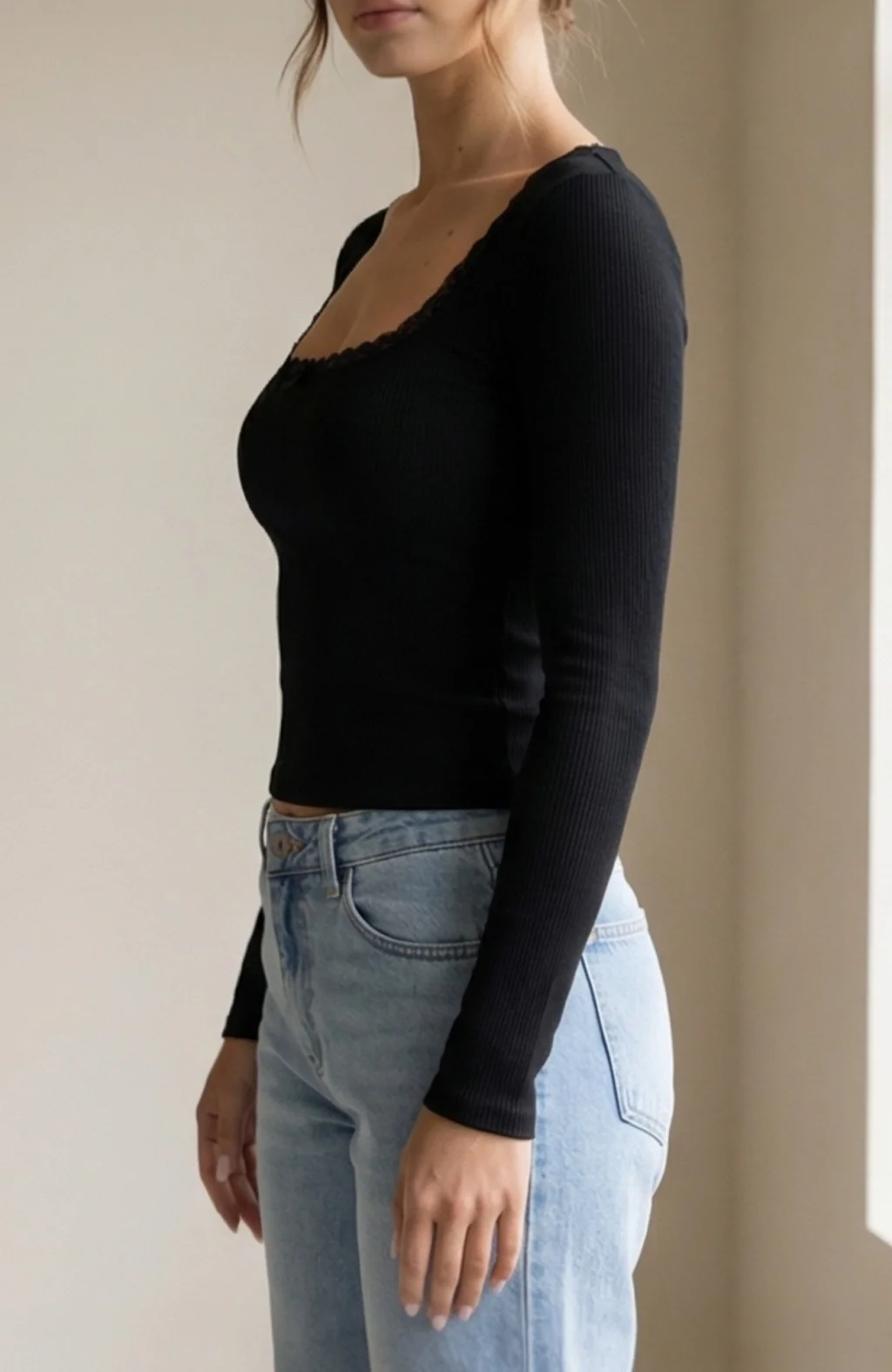 Zarif dantel detaylarıyla süslenmiş, klasik siyah renkteki bu crop top bluz, her türlü özel etkinlikte şıklığınızı tamamlar.