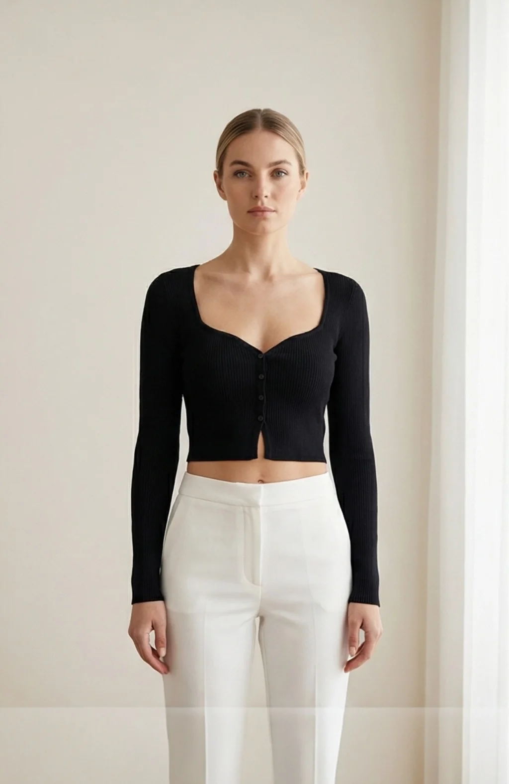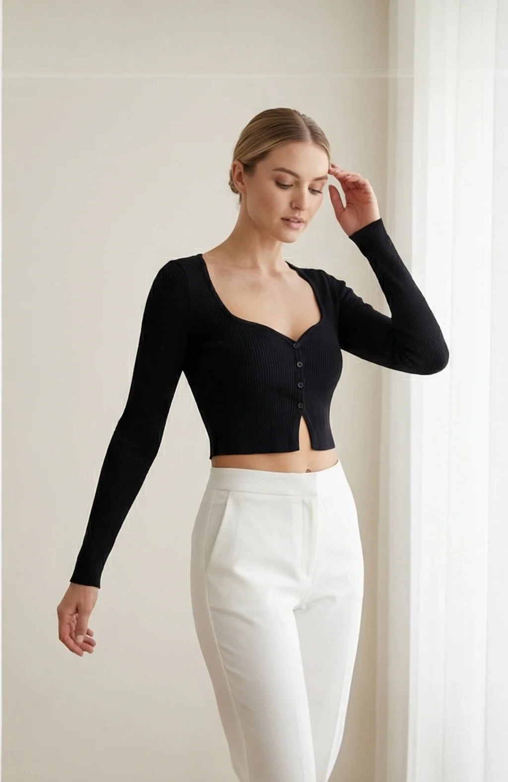 Kadın Siyah Uzun Kollu Düğmeli Göğüs ve Göbek Dekolteli Crop Top Bluz – Şık, Rahat ve Kolay Kombinlenebilir