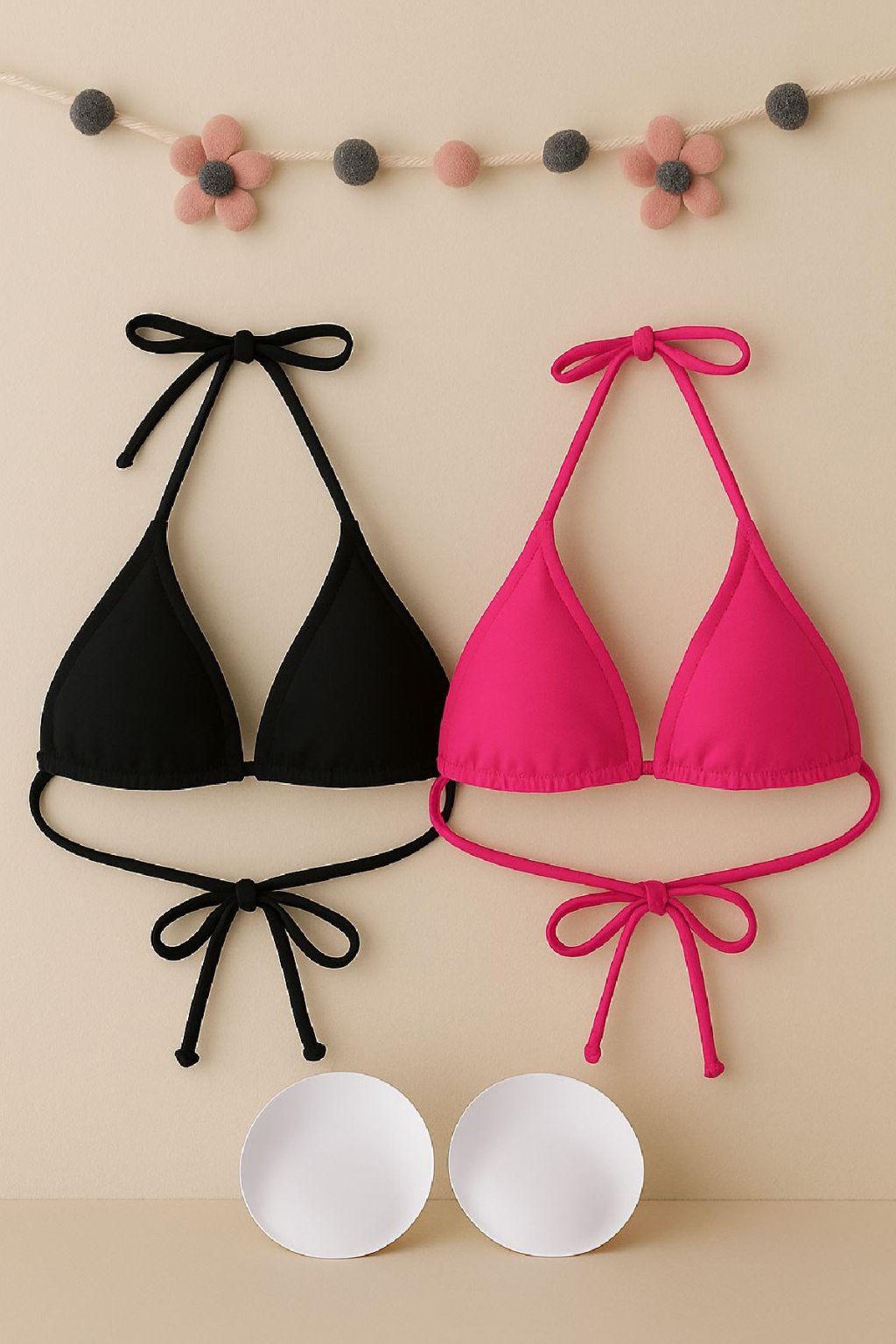 Zarif siyah ve canlı fuşya renk kombinasyonu ile dikkat çeken üçgen bikini üstü, plaj modasına şıklık katıyor.